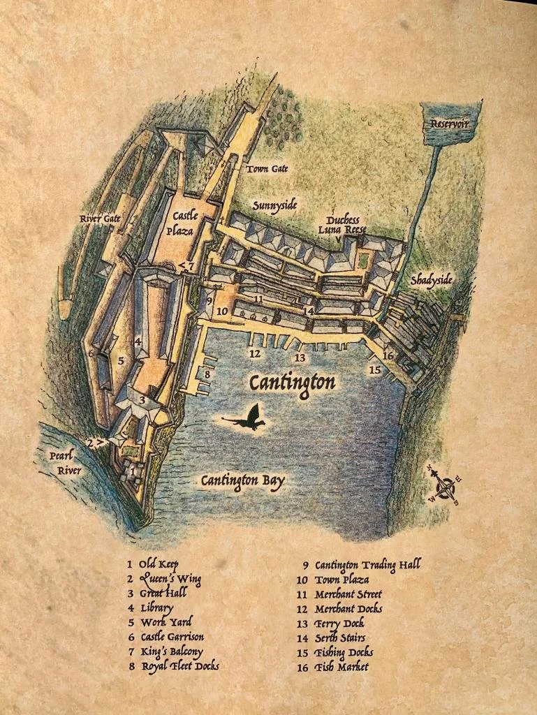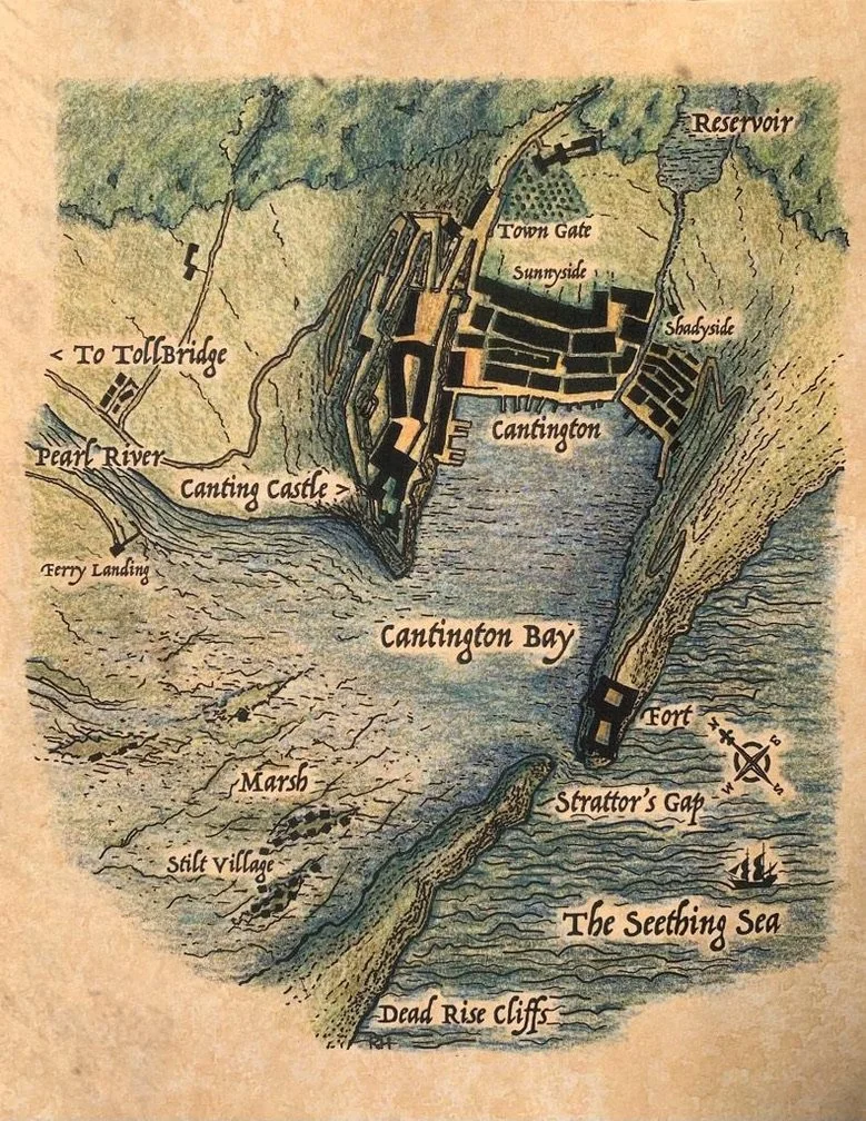 The events in True Treasure take us east from Morganshire to the great city of Cantington. Canting Castle is high on a prominence jutting into Cantington. Can you find where the Pearl River joins the waters of the bay?