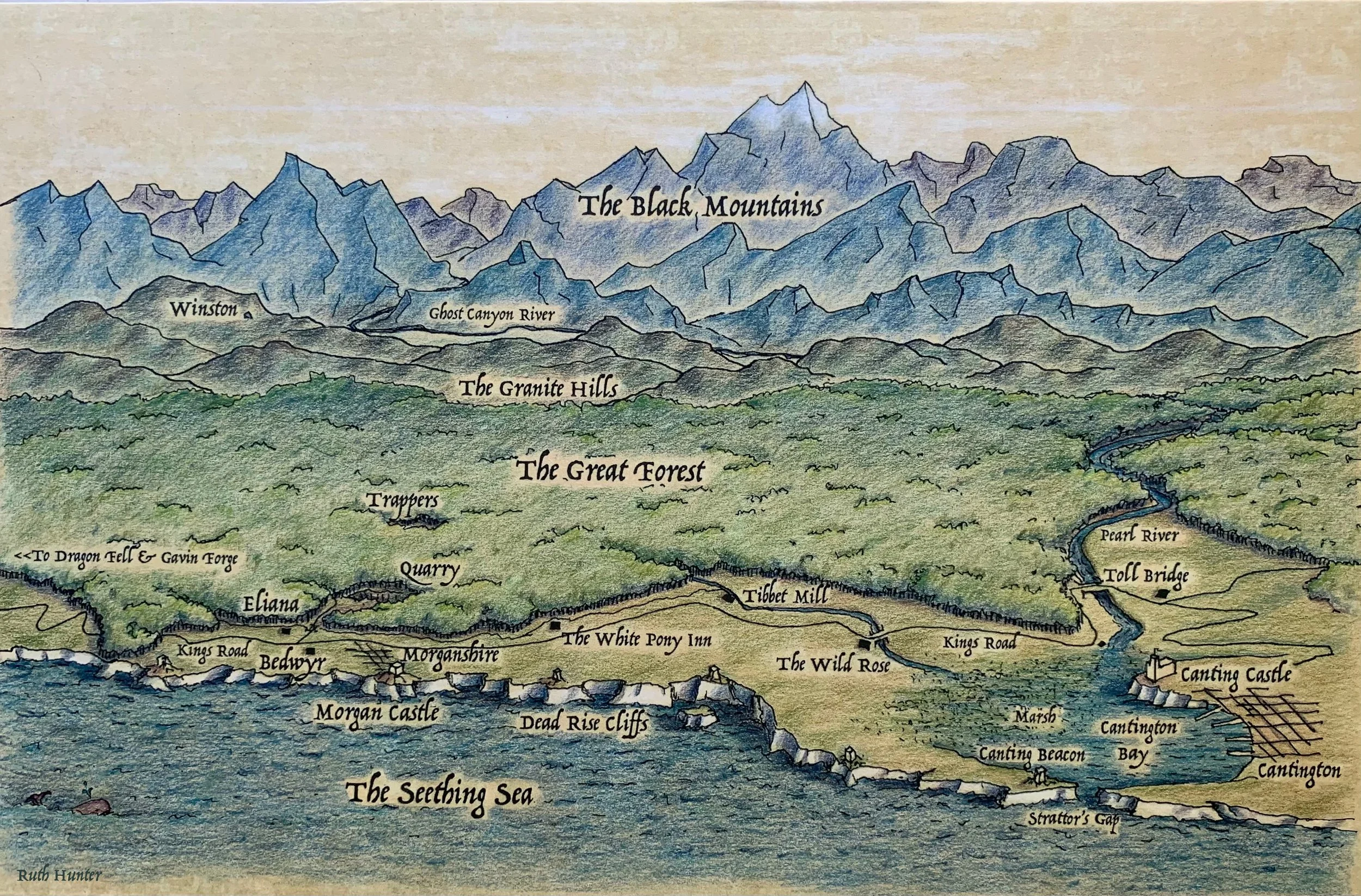 Twelve-year old Eliana lives with her family in the countryside of Morganshire, which is just north of the Dead Rise Cliffs. These aptly named cliffs drop to the Seething Sea. Just beyond Kings Road is the Great Forest. North of the forest are the Granite Hills and the Black Mountains.